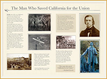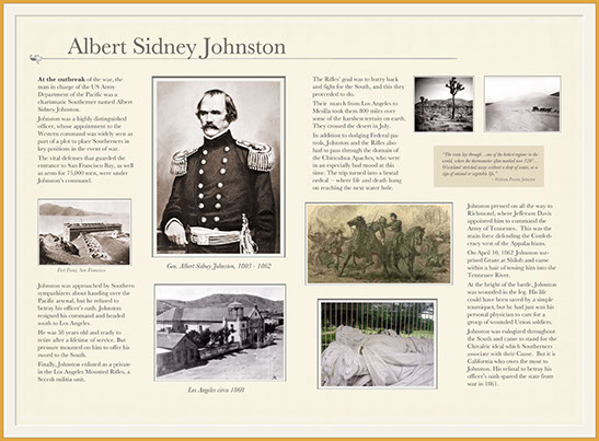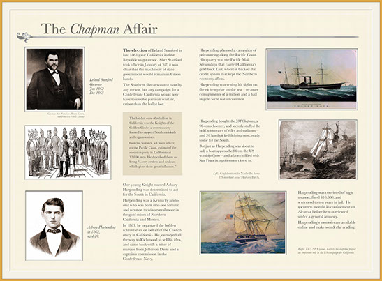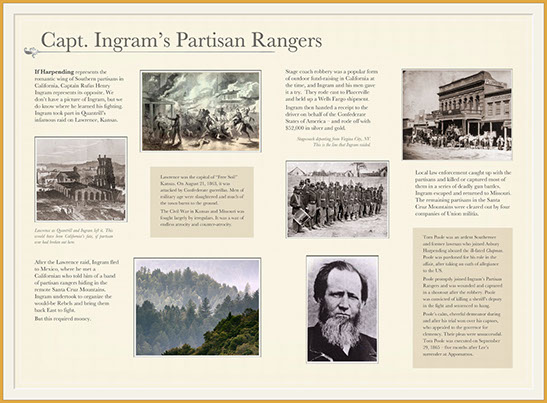 The exhibit is comprised of 16 graphic panels dealing with aspects of California history, up to and including the Civil War. Here is a list of the topics currently covered: